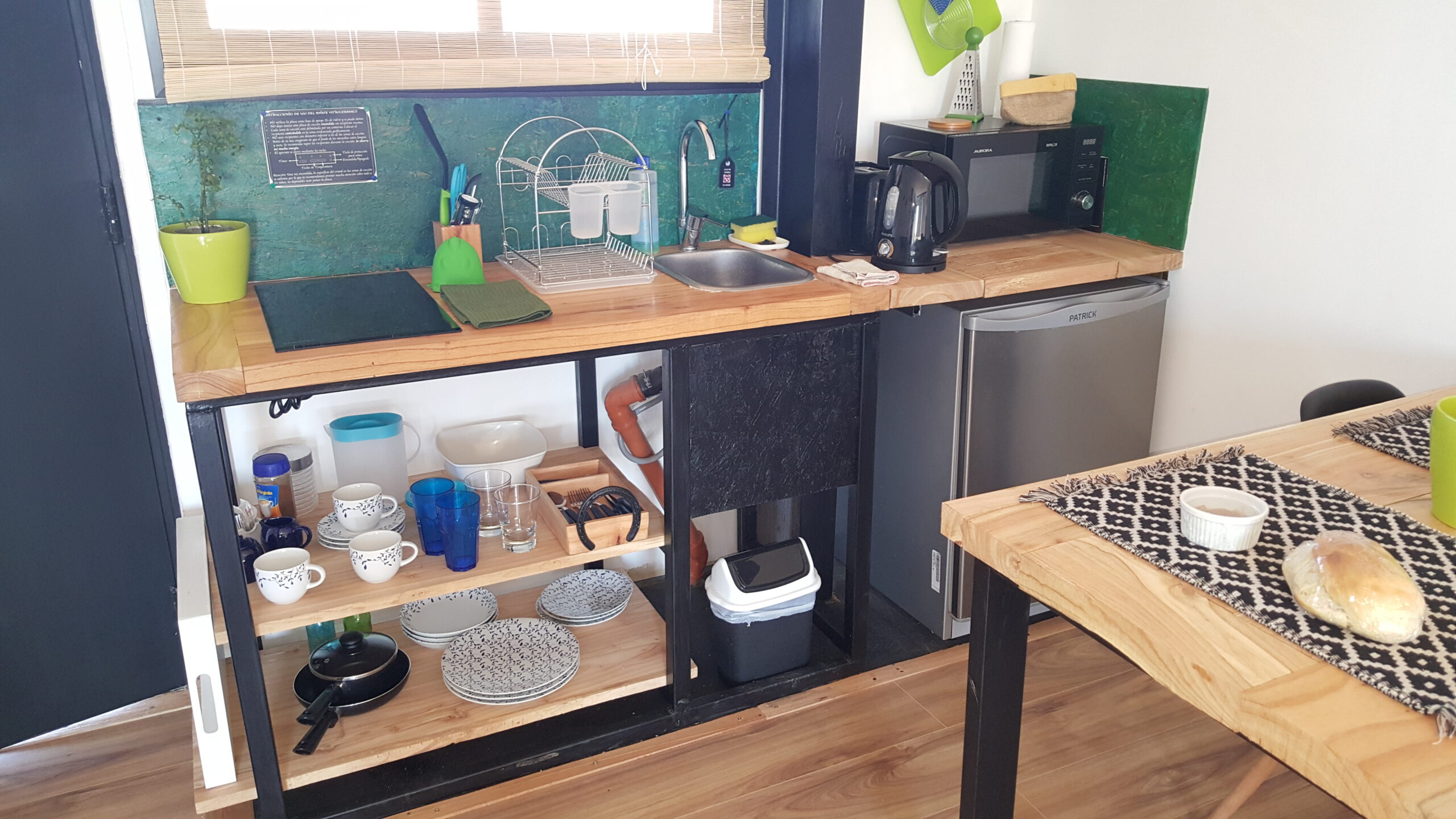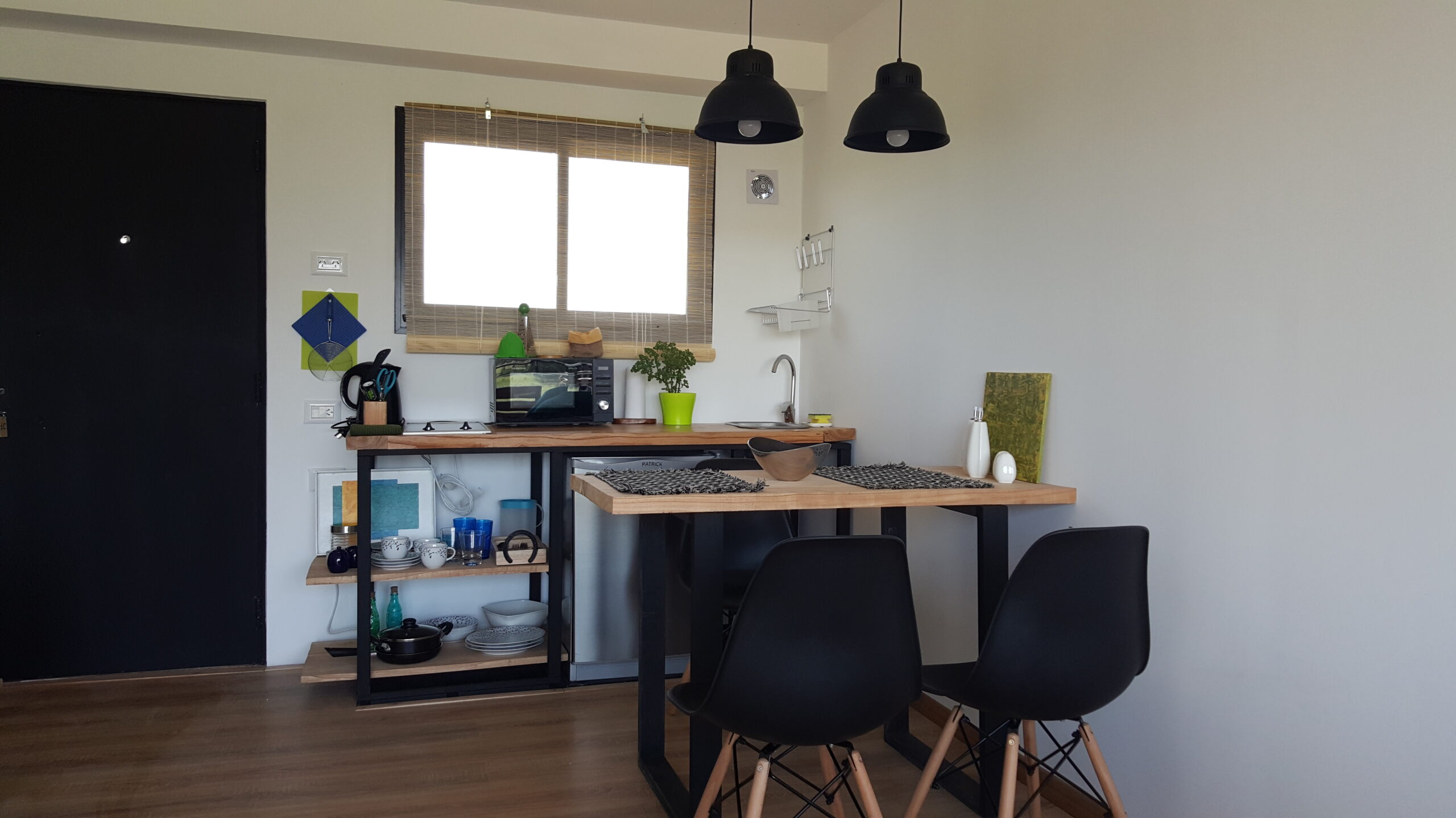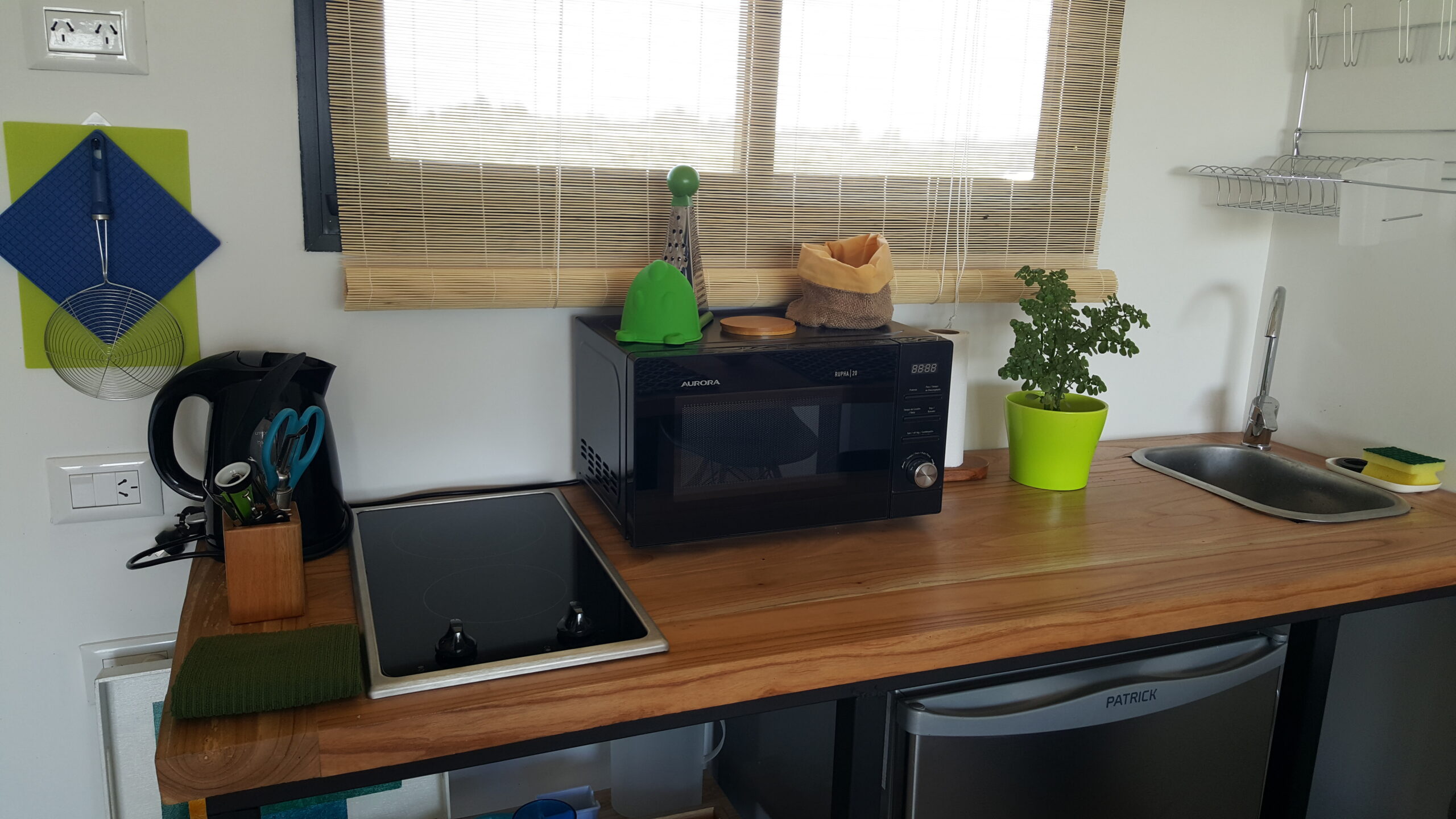 Kitchenette completa con anafe de 2 hornallas, microondas, heladera bajo mesada, pava eléctrica, tostadora y vajilla.