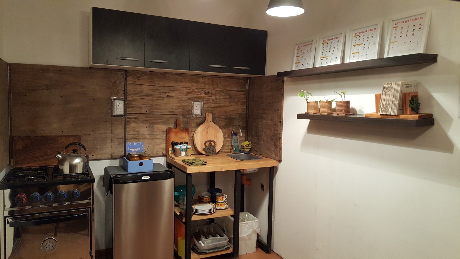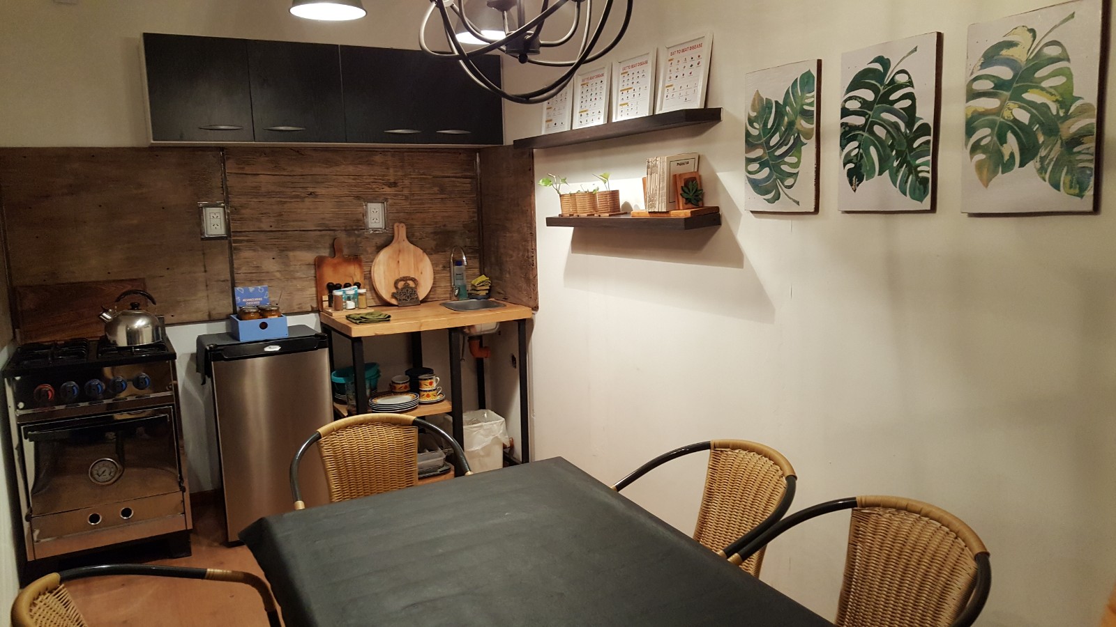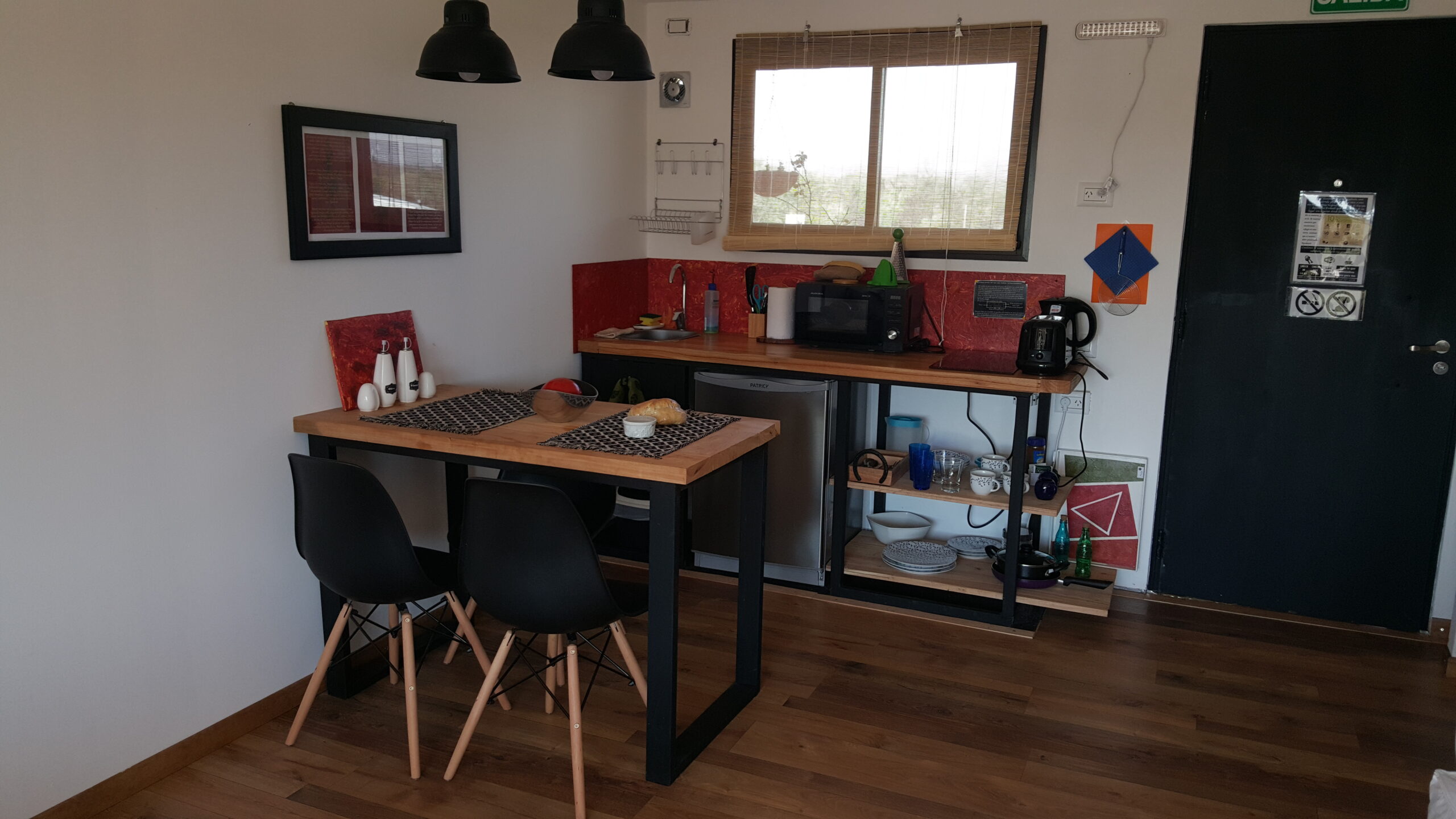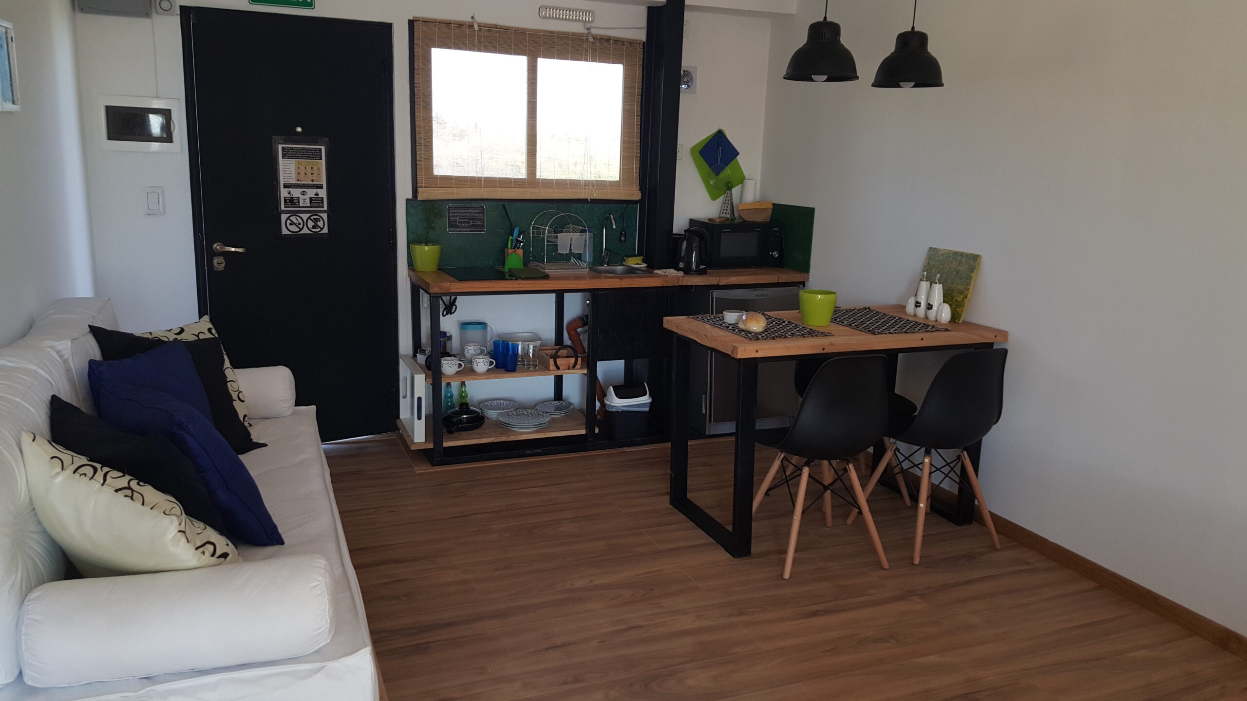 Kitchenette completa con anafe de 2 hornallas, microondas, heladera bajo mesada, pava eléctrica, tostadora y vajilla.